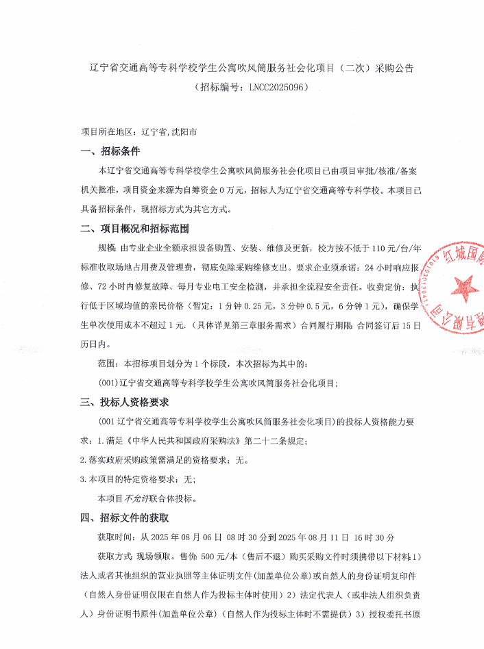 学生公寓吹风筒服务社会化项招标公告二次(LNCC2025096)