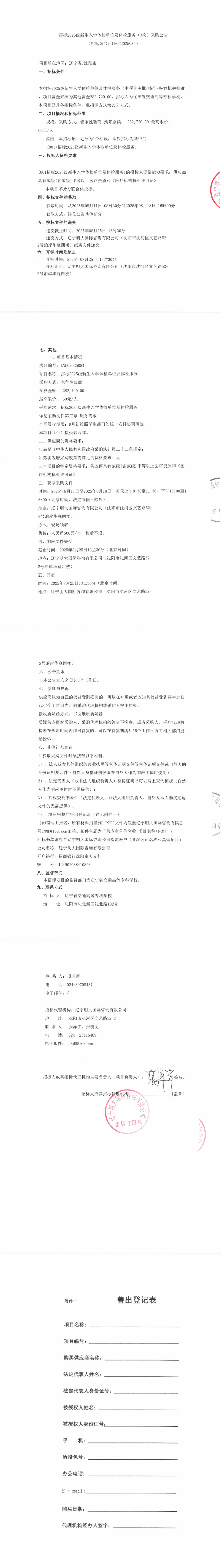 招标2025级新生入学体检单位及体检服务(3次)采购公告(LNCC2025084)