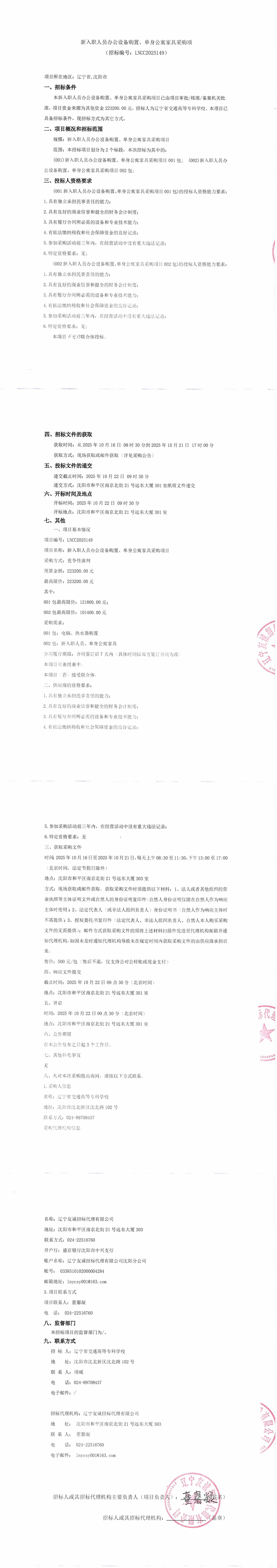 新入职人员办公设备购置、单身公寓家具采购项目招标公告(LNCC2025149)