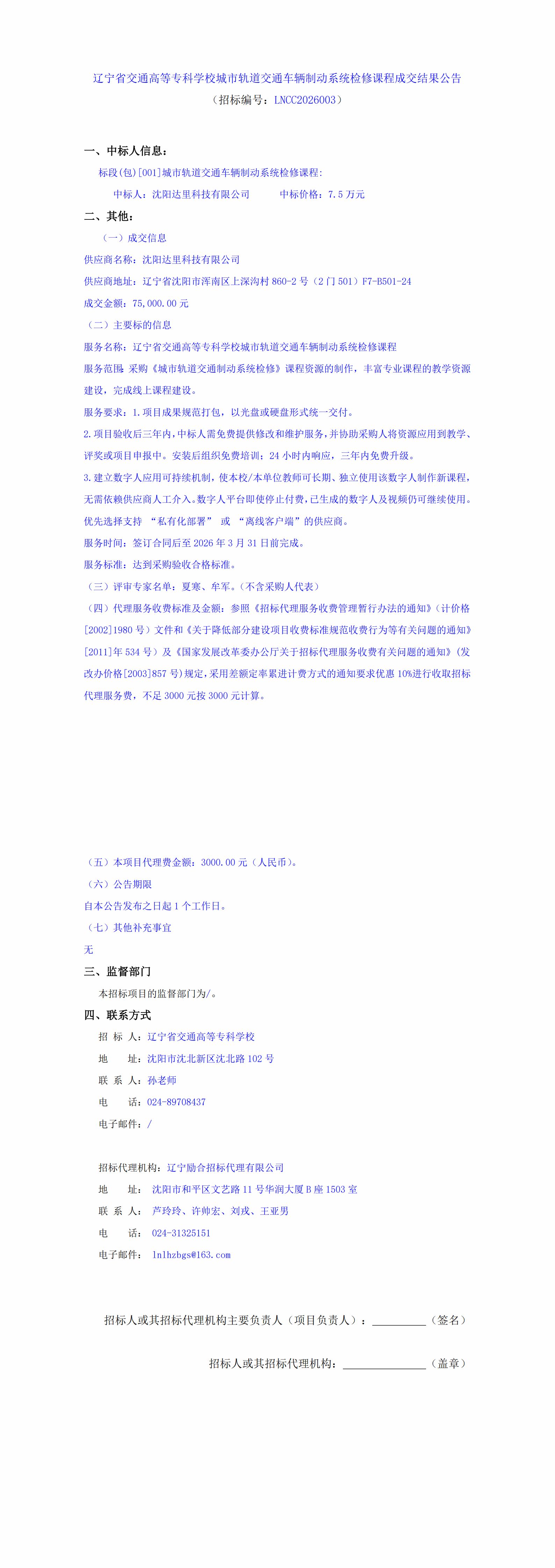 辽宁省交通高等专科学校城市轨道交通车辆制动系统检修课程成交结果公告