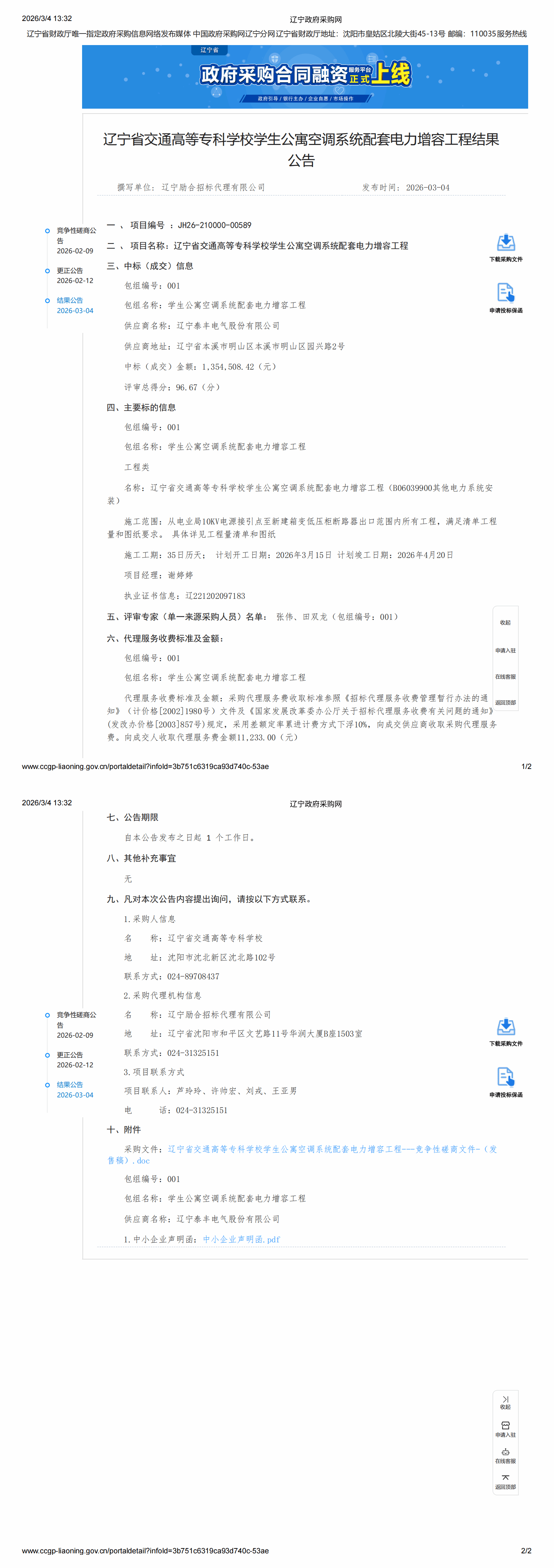 辽宁省交通高等专科学校学生公寓空调系统配套电力增容工程结果公告