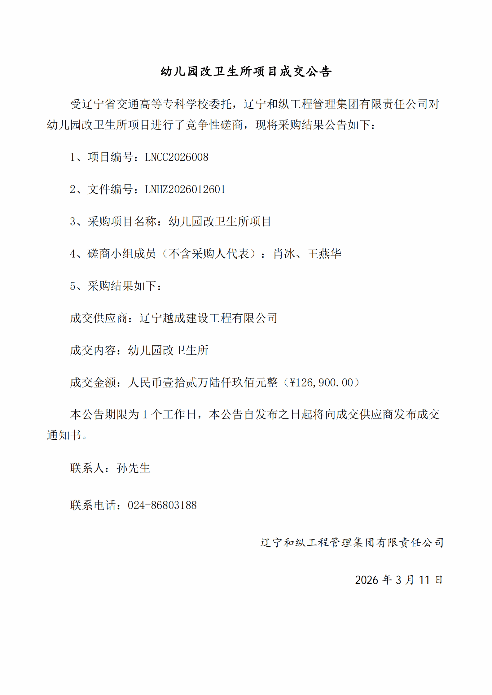 幼儿园改卫生所项目采购结果公告(LNCC2026008)