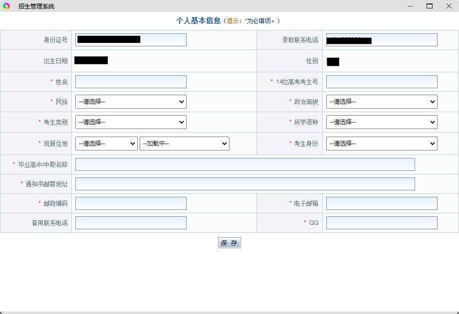 第五步:注册完成后,输入账号密码,进入报名系统,首先需填写个人报名信息,完成后点击保存!(红色星号为必填)