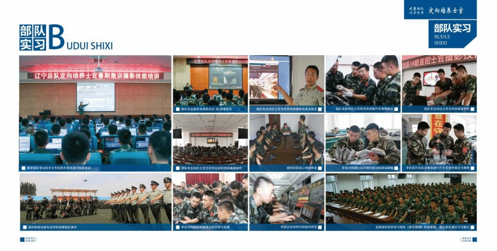 技能培养:根据岗位需求,从第二学期开始,每学期会给大家安排2-3门的课程综合实训。重点提升警士的摄影、摄像、军事展板设计、三维交互、网页设计、视频编辑等能力的提升。利用每年的暑假期间进行为期三周的军队实践,第五学期进行入伍分配及入伍训练,第六学期进行军队专业岗位实习。