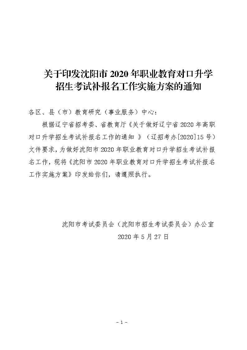 关于印发沈阳市2020年职业教育对口升学招生考试补报名工作实施方案的通知